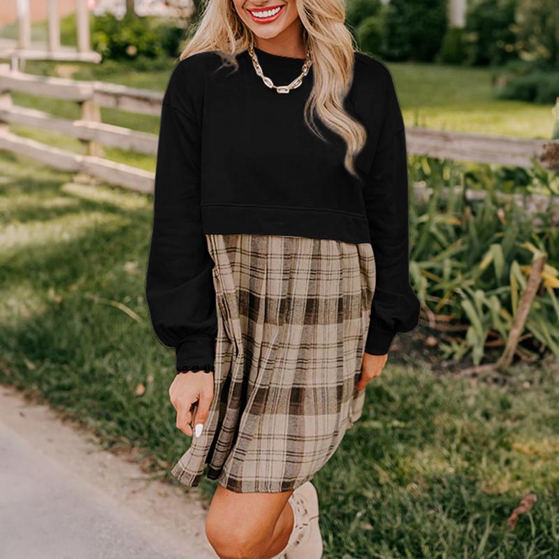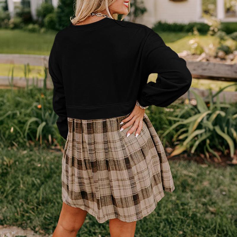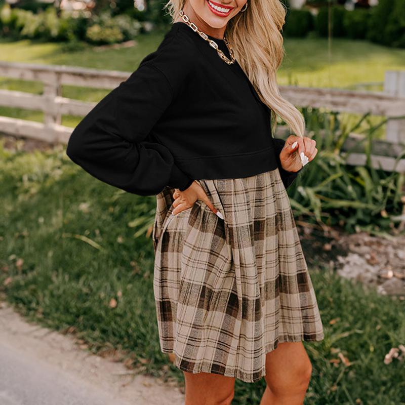 Beige Plaid Patchwork High Waist Sweatshirt Mini Dress for Women