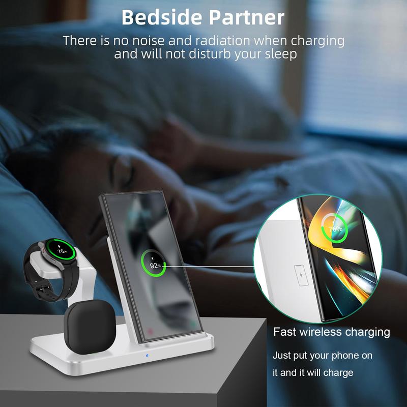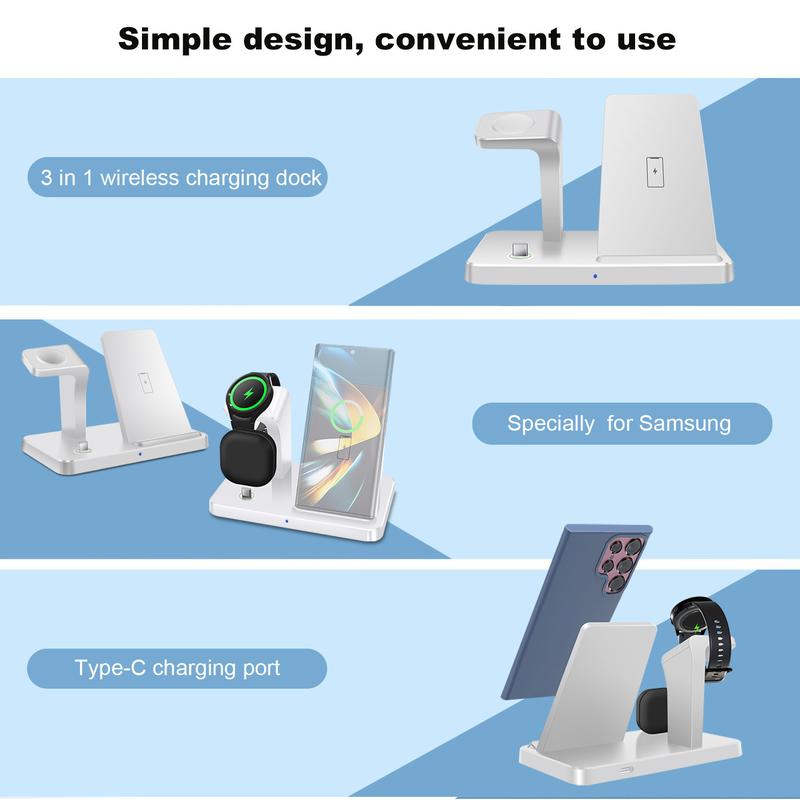 [3-in-1 Fast Wireless Charger] Wireless charging station. This 3-in-1 charging station allows you to charge multiple devices at the same time in one place, neat and organized. Charge your Galaxy Phone/ Galaxy Watch/Galaxy Buds at the same time, also as a phone holder. The wireless charger fully charges your phone for approximately 2-3 hours. Recommended: Use the USB-C adapter (not included).